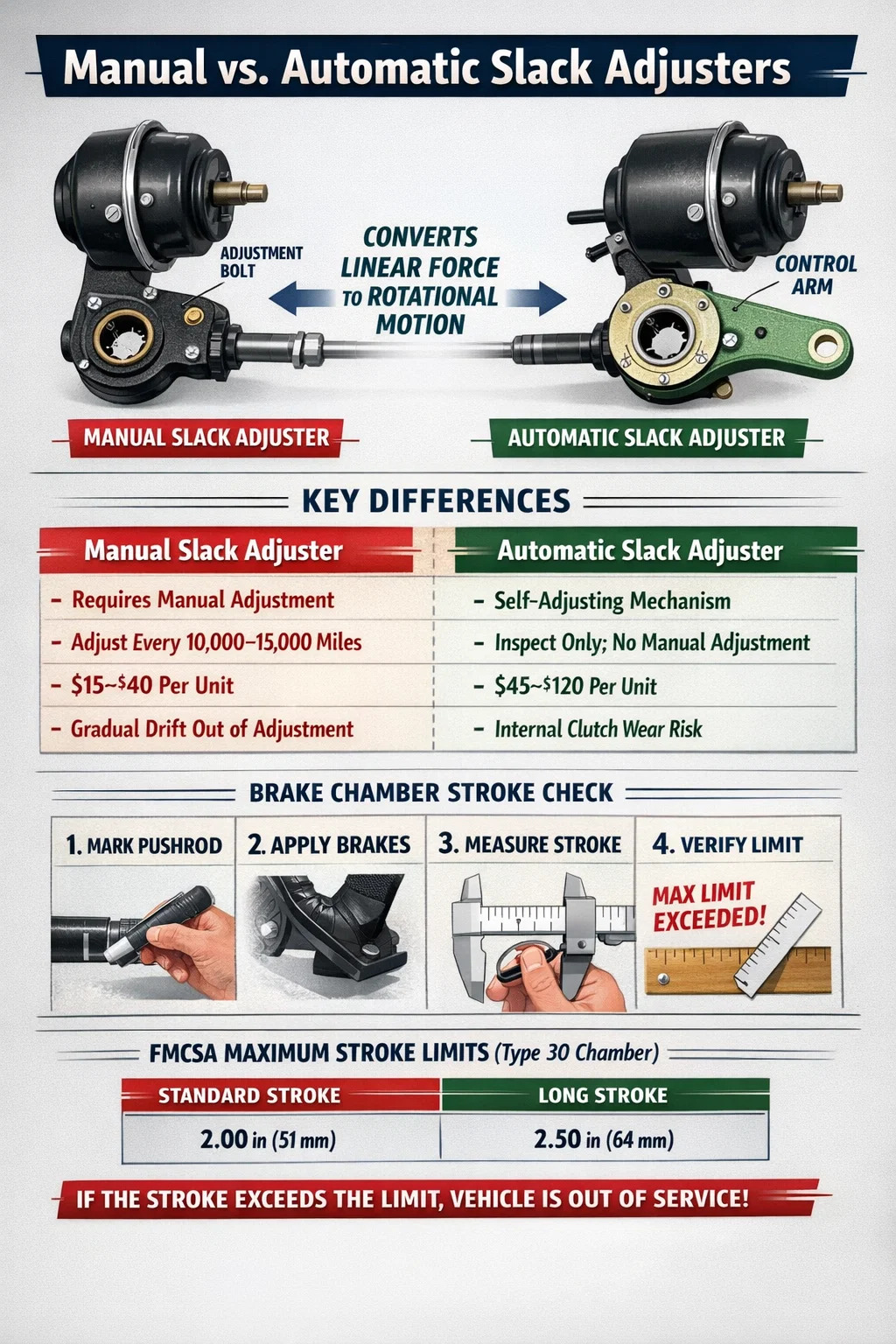 Manuelle slækjusteringer kræver, at en tekniker fysisk drejer en justeringsbolt - typisk en 9/16-tommer sekskantbeslag - for at rotere snekkegearet inde i justeringslegemet og ændre positionen af bremseknastakslen. Der er ingen selvkorrigerende mekanisme. Hvis chaufføren eller flådevedligeholdelsesteamet ikke følger et planlagt inspektionsinterval, går justeringen ud af specifikationen, efterhånden som foringen slides. Ved operationer med store kilometertal kan dette ske inden for en enkelt uge efter service.